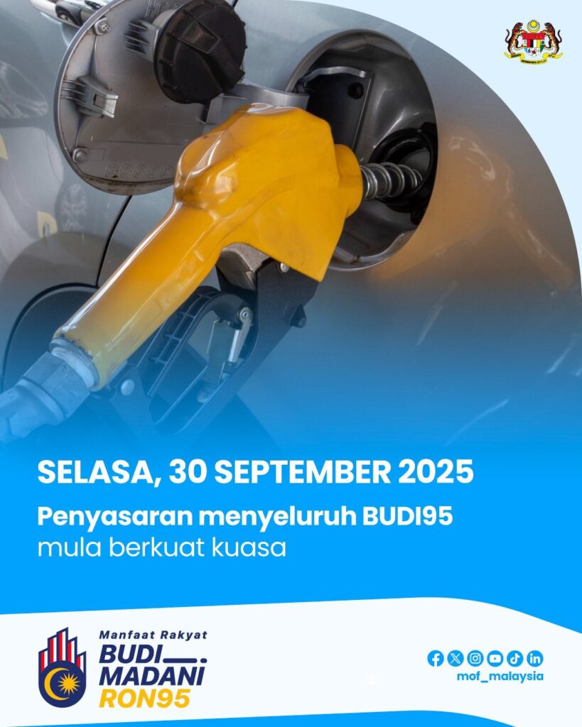 Penyasaran menyeluruh BUDI95 akan bermula pada 30 September 2025.