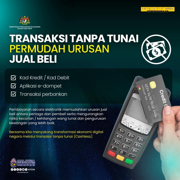 Transaksi Tanpa Tunai (cashless) memudahkan urusan jual beli antara peniaga dan pembeli. Risiko kecurian atau kehilangan wang tunai dapat dikurangkan serta pengurusan kewangan yang lebih baik. #KPDN#KPDNKita#MalaysiaMADANI#CashlessSociety