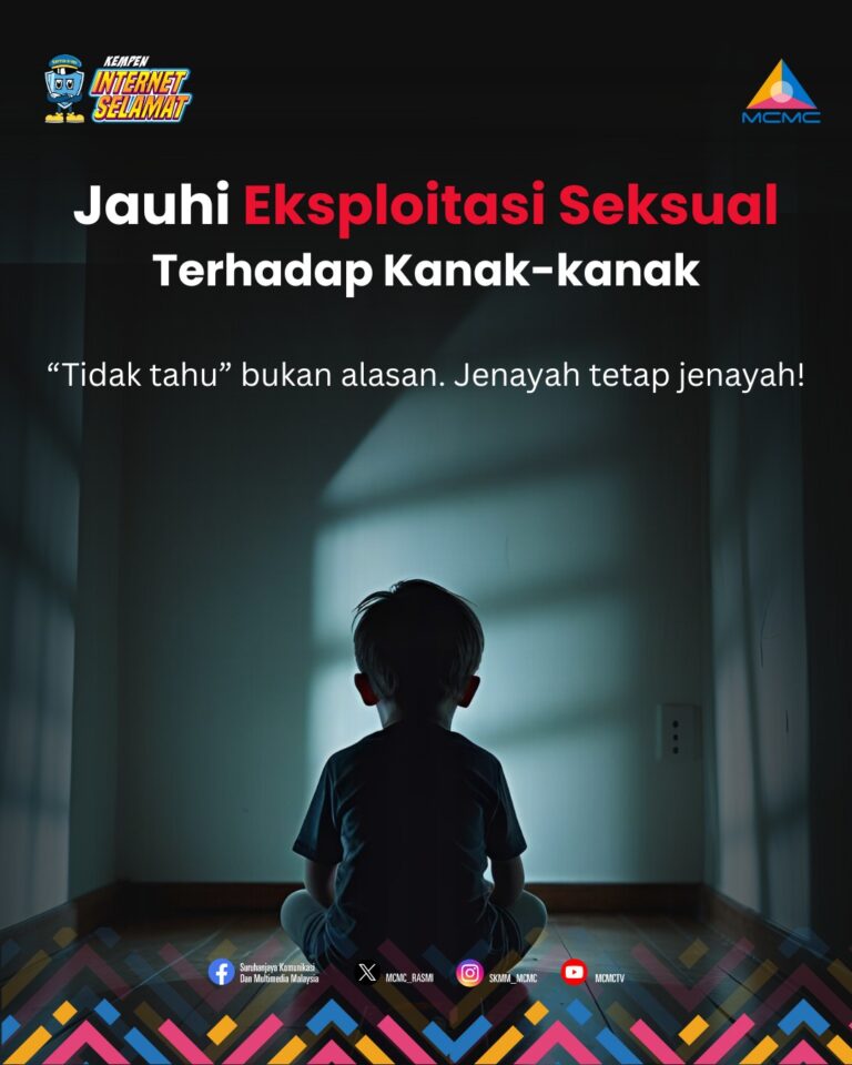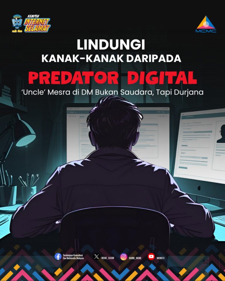 Kanak-kanak semakin terdedah kepada pemangsa seksual di platform digital. Perhatikan aktiviti mereka dalam talian. Bina komunikasi terbuka. Jadilah pelindung, bukan penonton. Laporkan sebarang kandungan atau individu yang mencurigakan kepada pihak berkuasa. #MCMC #KempenInternetSelamat