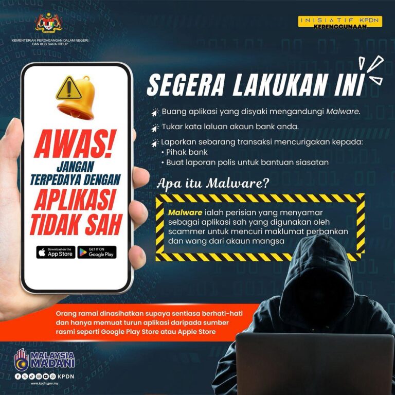 Aplikasi percuma dengan menawarkan pelbagai ganjaranJangan terus muat naik aplikasi sekiranya aplikasi nampak mencurigakan! Buang aplikasi yang disyaki mengandungi Malware Segera tukar kata laluan akaun bank anda sekiranya menerima notifikasi transaksi tidak sah Laporkan sebarang transaksi mencurigakan kepada:β’ Pihak bankβ’ […]