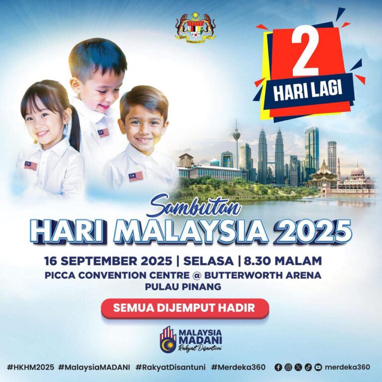 Semarakkan semangat βMalaysia MADANI: Rakyat Disantuniβ di Sambutan Hari Malaysia 2025 pada 16 September ini di Pusat Konvensyen PICCA@Arena Butterworth, Pulau Pinang. Rakam momen bersama-sama dan muat naik di media sosial dengan tanda pagar #HKHM2025#MalaysiaMADANI#RakyatDisantuni#Merdeka360 #KementerianKomunikasi#MADANIBekerja#RancakkanMADANI#BersamaMalaysiaku#TaatSetia