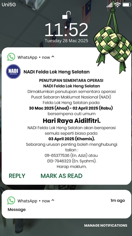 Dimaklumkan penutupan sementara operasi Pusat Sebaran Maklumat Nasional (NADI) Felda Lok Heng Selatan pada 30 Mac 2025 (Rabu) hingga 03 April 2025 (Rabu) bersempena : Cuti Umum Hari Raya Aidilfitri NADI Felda Lok Heng Selatan akan beroperasi semula seperti biasa […]
