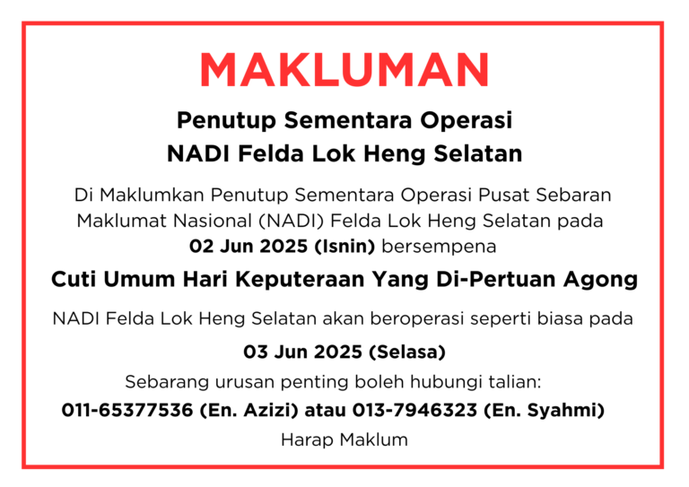 Di Maklumkan Penutup Sementara Operasi Pusat Sebaran Maklumat Nasional (NADI) Felda Lok Heng Selatan pada 02 Jun 2025 (Isnin) bersempena Cuti Umum Hari Keputeraan Yang Di-Pertuan Agong NADI Felda Lok Heng Selatan akan beroperasi seperti biasa pada 03 Jun 2025 […]