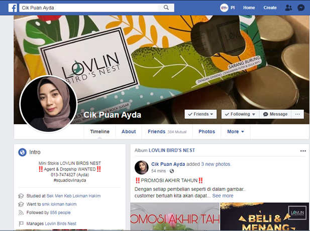 – Siti Nur Syahima mempunyai perniagaan menjual perhiasan wanita yang diusaha sendiri. – Beliau menjual barangan seperti tudung, pewangi, baju, kasut dan lain-lain lagi. – Mula mengikuti kelas di pusat internet pada 2018. |